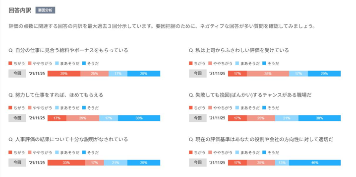 それは「評価」についてなのか、「キャリア」についてなのか、あるいは「職場全体との関係性」についてなのか、どんな内容に関する結果なのか深ぼってみる必要があります。