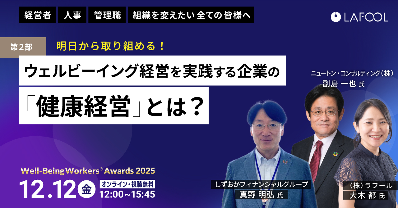 株式会社ラフールでは2025年12月12日(金)にウェルビーイング/人的資本経営の実践的な事例を紹介するイベント『Well-Being Workers®︎ Awards 2025』を開催します。こちらの記事では第1部の内容をピックアップしてご紹介させていただいております!