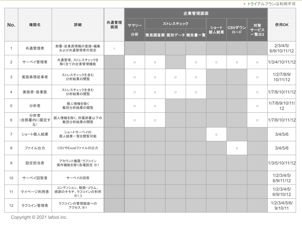 【2】トライアルプランの場合、分析者・分析者(自部署内限定)設定担当者、ショート個人結果、ファイル出力のアカウント権限は使用いただけません。また、登録人数に上限がございます。